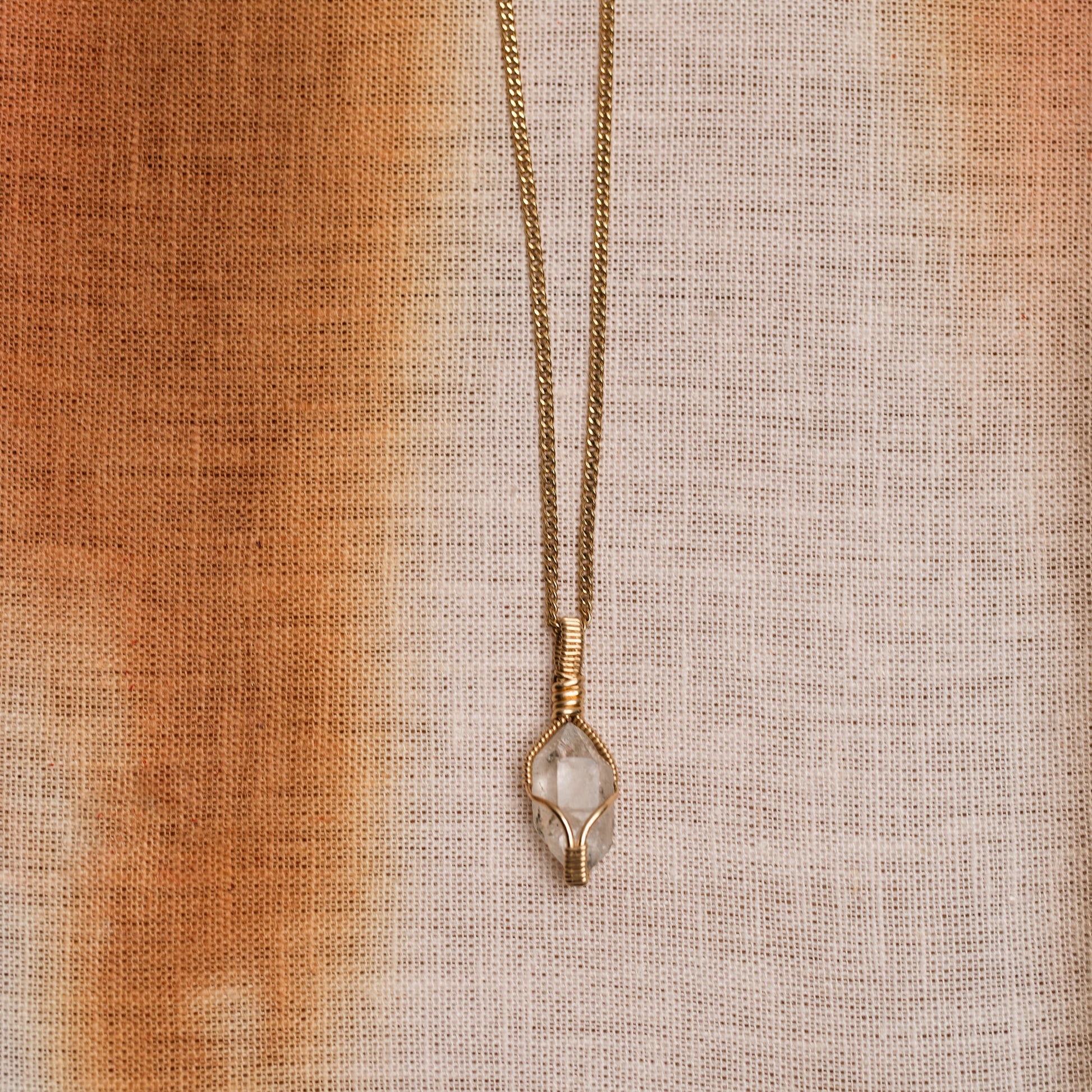 This handmade necklace features a dazzling Herkimer diamond, carefully wrapped in 14k gold-filled wire. Known for its high vibrational energy, Herkimer diamond is believed to enhance spiritual growth, clarity, and amplify intentions. Its natural, double-terminated crystal structure sparkles with an ethereal beauty, perfectly complemented by the warm gold wire. The intricate wrapping highlights the stone's raw brilliance, creating a piece that is both striking and meaningful. Whether worn on special occasions or as a cherished personal piece, this necklace combines elegance with the powerful energy of the Herkimer diamond, making it a beautiful talisman for light and clarity.
