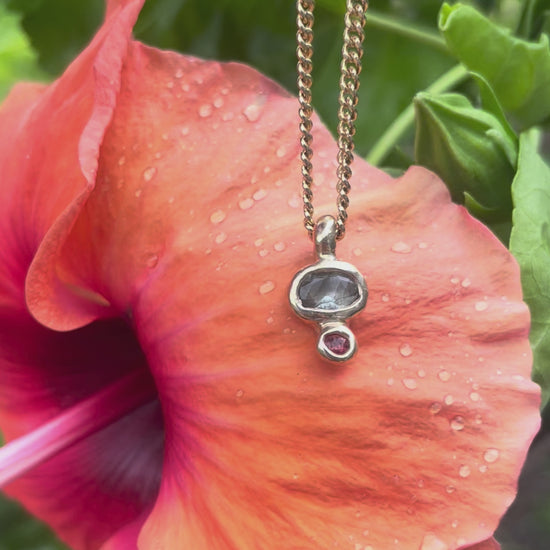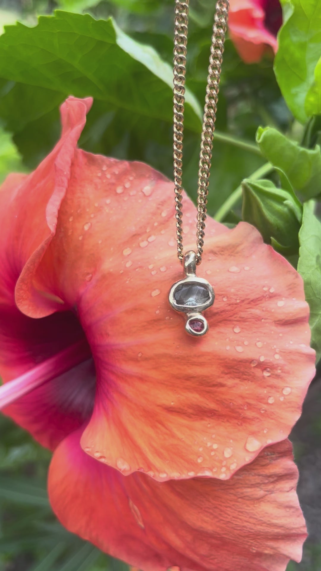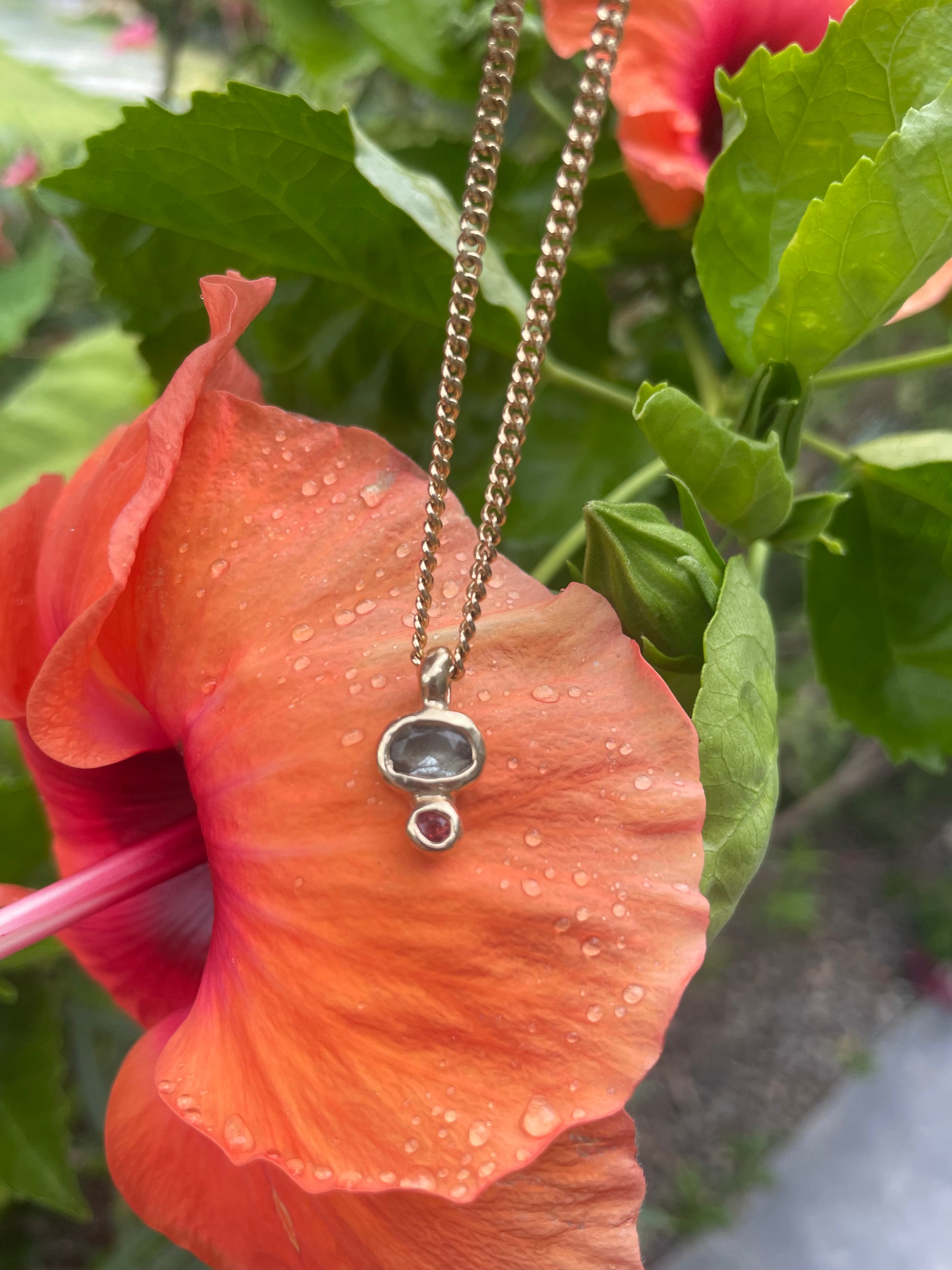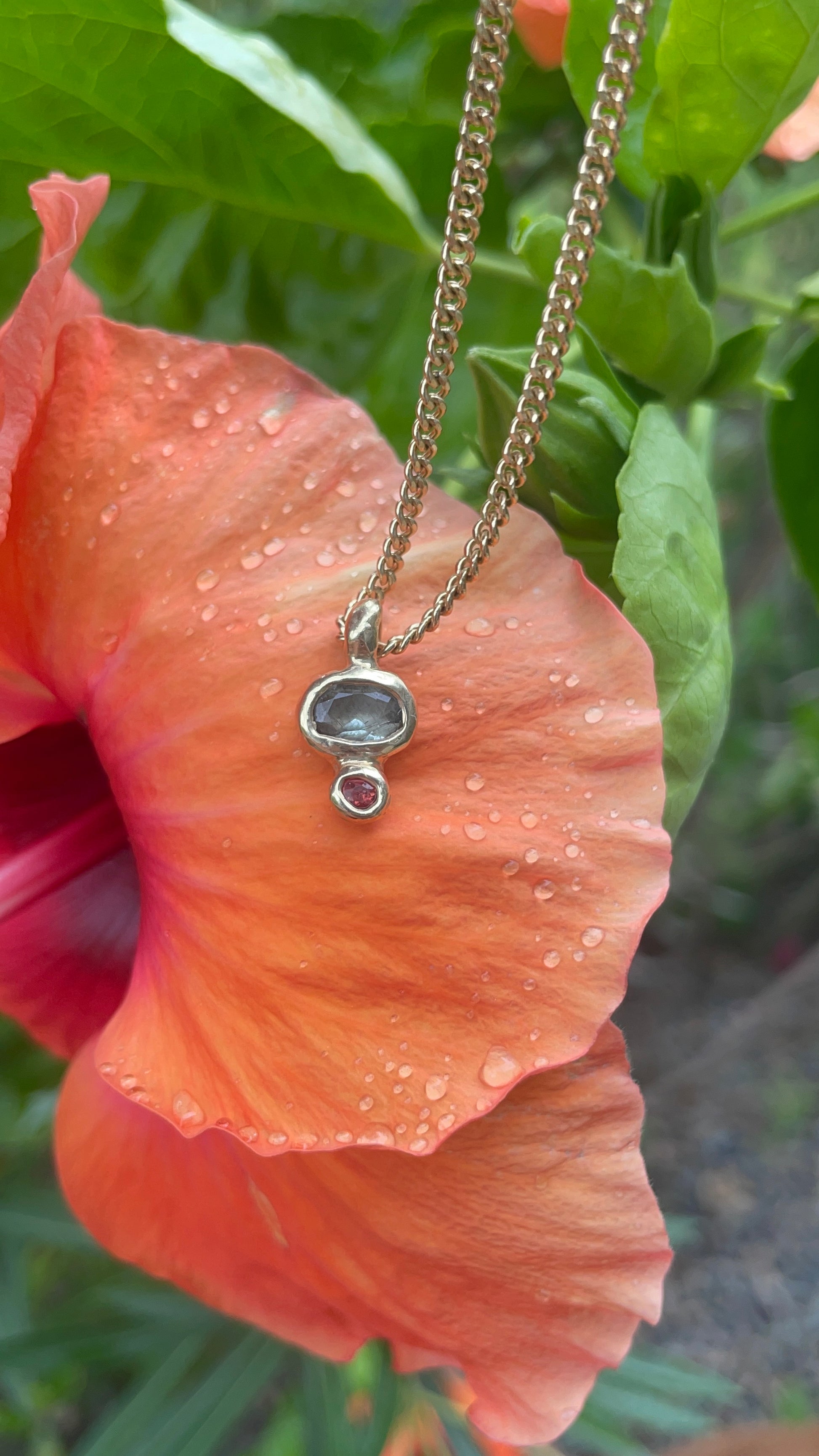 This little pendant made me think of a Teletubby. It features, a moss aquamarine and a teeny tiny red tourmaline. I absolutely loved making this piece and if it sells and you like it, please don't hesitate to shoot me a message. I can create a new one for you with the exact color combination you desire.
