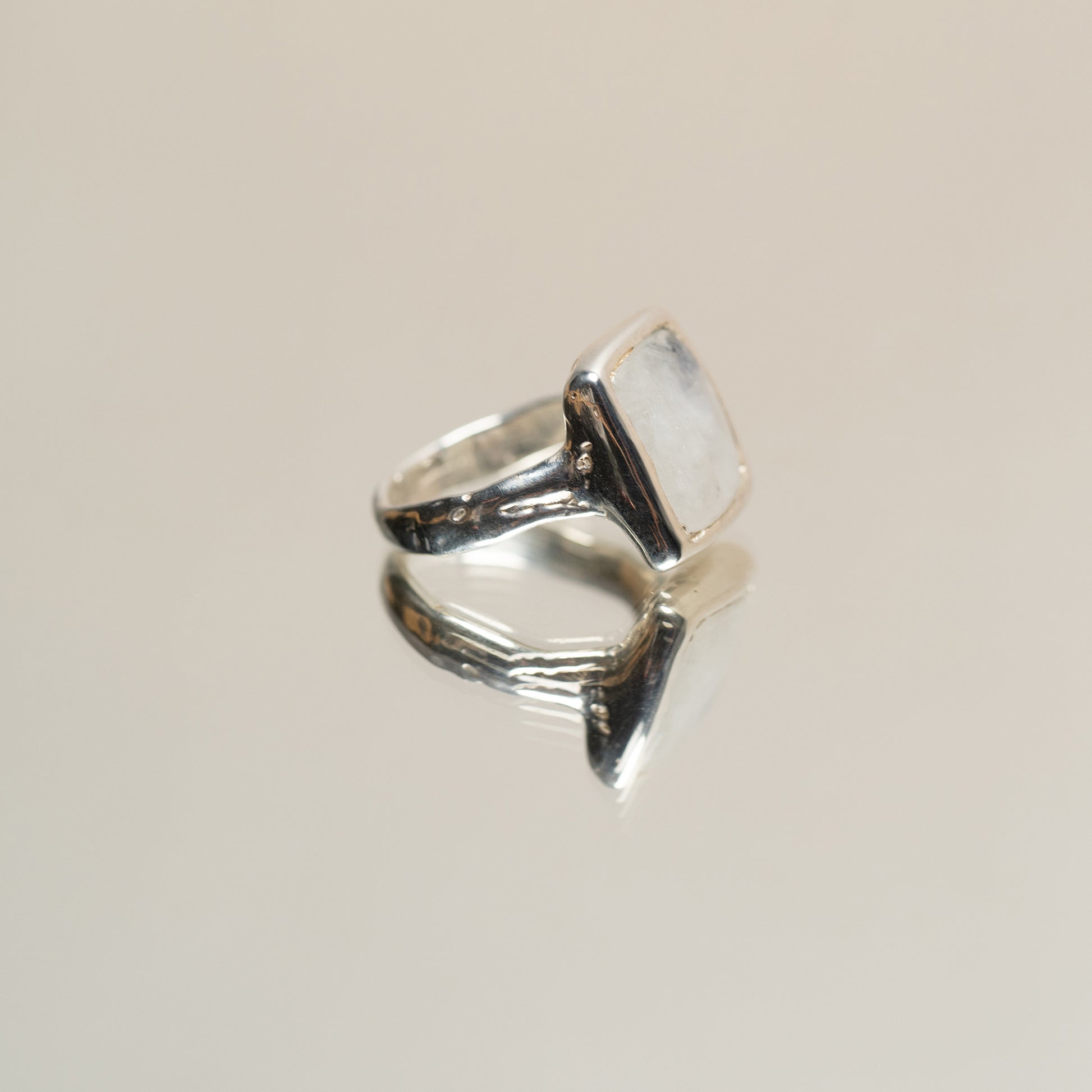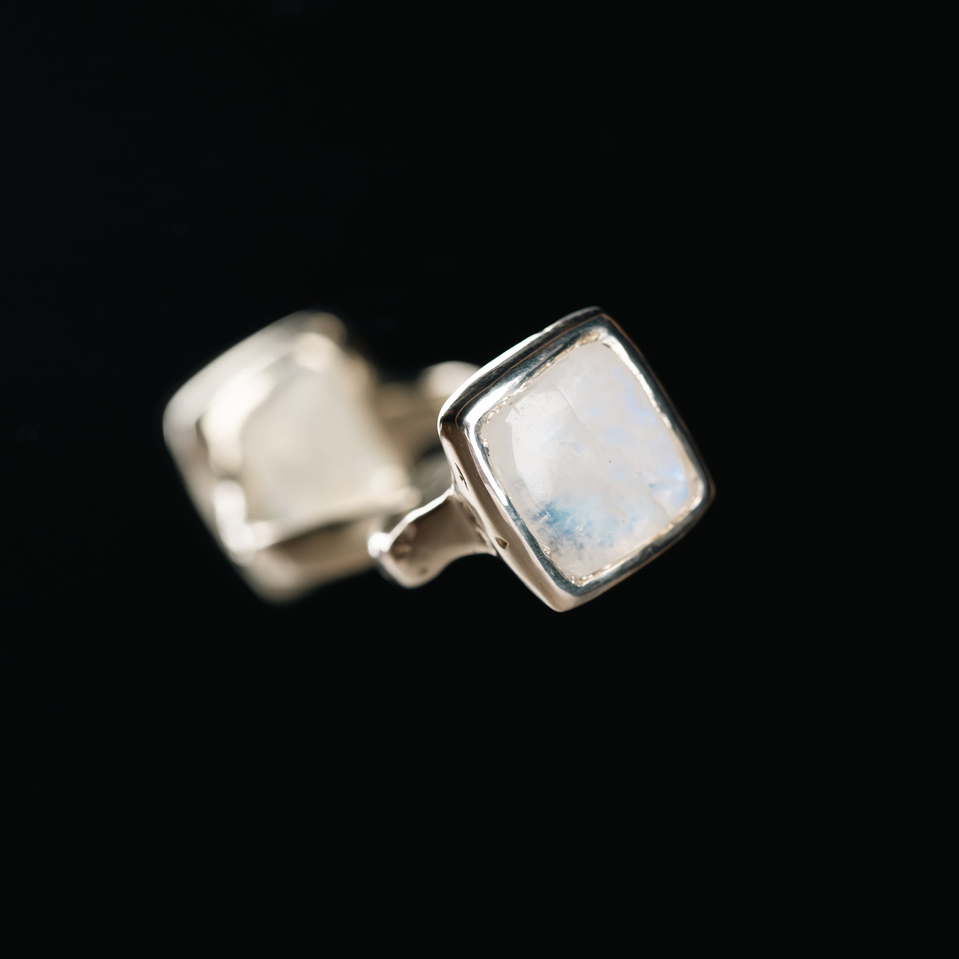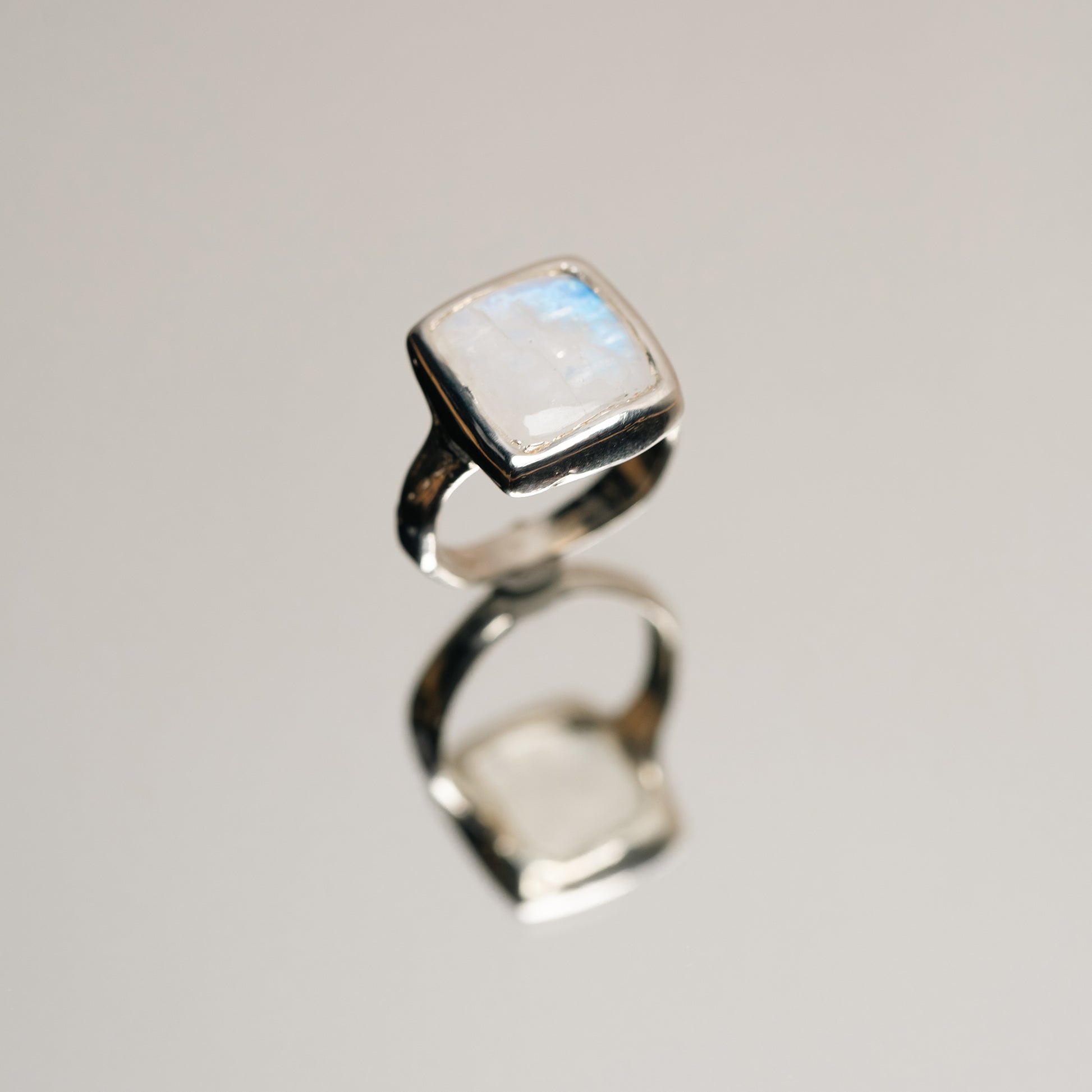 When I created this ring, the first thought that came to mind was “The Moon Is Mine,” a beautiful song by Fairground Attraction that my mom played during my childhood. This inspiration resonates in the ring's enchanting design, making it feel like a personal tribute to cherished memories. The ring is a bold statement piece that is sure to catch anyone's eye. Encased in a delicate 925 silver frame, the moonstone captures light in a way that evokes the magic of moonlit nights. The flowing band is gracefully designed, thin enough to ensure comfort, making it perfect for any occasion, whether it be a casual outing or a special event. With its unique blend of elegance and boldness, this ring is not just a piece of jewelry; it’s a captivating expression of personality and style.