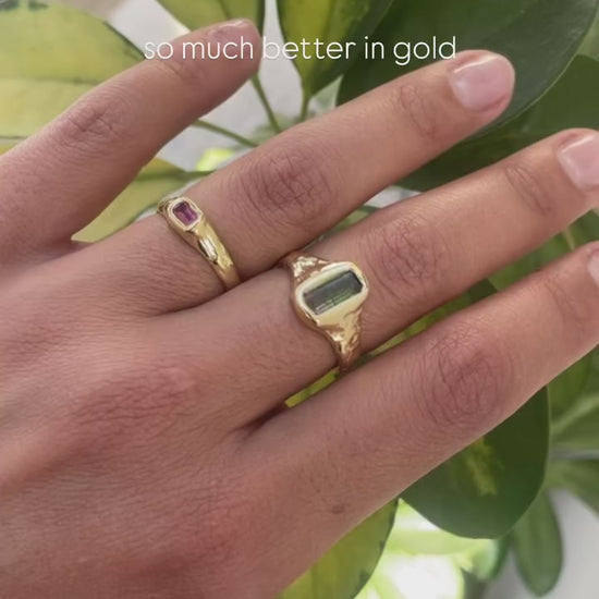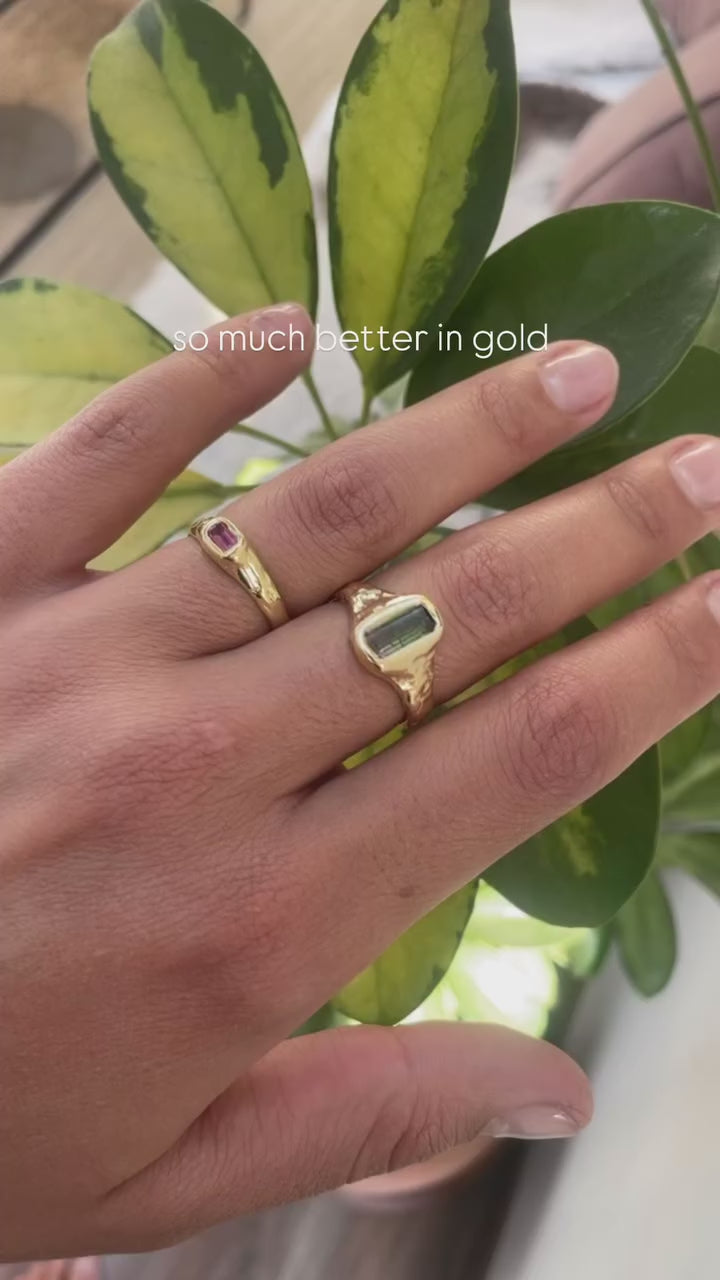 The Whisper Ring draws its name from the desire to craft a piece that’s effortlessly wearable every day. Its design is elegantly simple yet holds something special—a small, delicate stone that adds just a hint of sparkle. Not too bold, but rather a subtle 'whisper' of beauty, the pink sapphires catch the light with a soft, eye-catching charm that’s both refined and captivating. Each Whisper ring will be hand sculpted from scratch and therefore may vary slightly in shape, making every piece a one-of-a-kind treasure.
